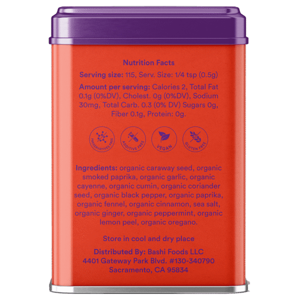 organic caraway seed, organic smoked paprika, organic garlic, organic cayenne, organic cumin, organic coriander seed, organic black pepper, organic paprika, organic fennel, organic cinnamon, sea salt, organic ginger, organic peppermint, organic lemon peel, organic oregano